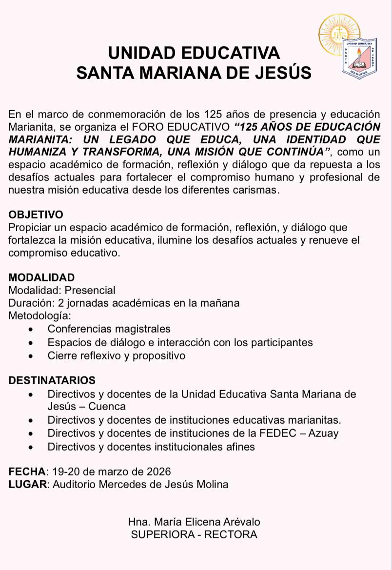 En el marco de la conmemoración de los 125 años de presencia y educación Marianita, la Unidad Educativa “Santa Mariana de Jesús”, está organizando el foro educativo “125 años de educación Marianita: un legado que educa, una identidad que humaniza y transforma, UNA MISIÓN QUE CONTINÚA”. Este será un espacio académico de formación, reflexión y diálogo, que da repuesta a los desafíos actuales para fortalecer el compromiso humano y profesional de misión educativa de las religiosas Marianitas, desde los diferentes carismas que poseen.