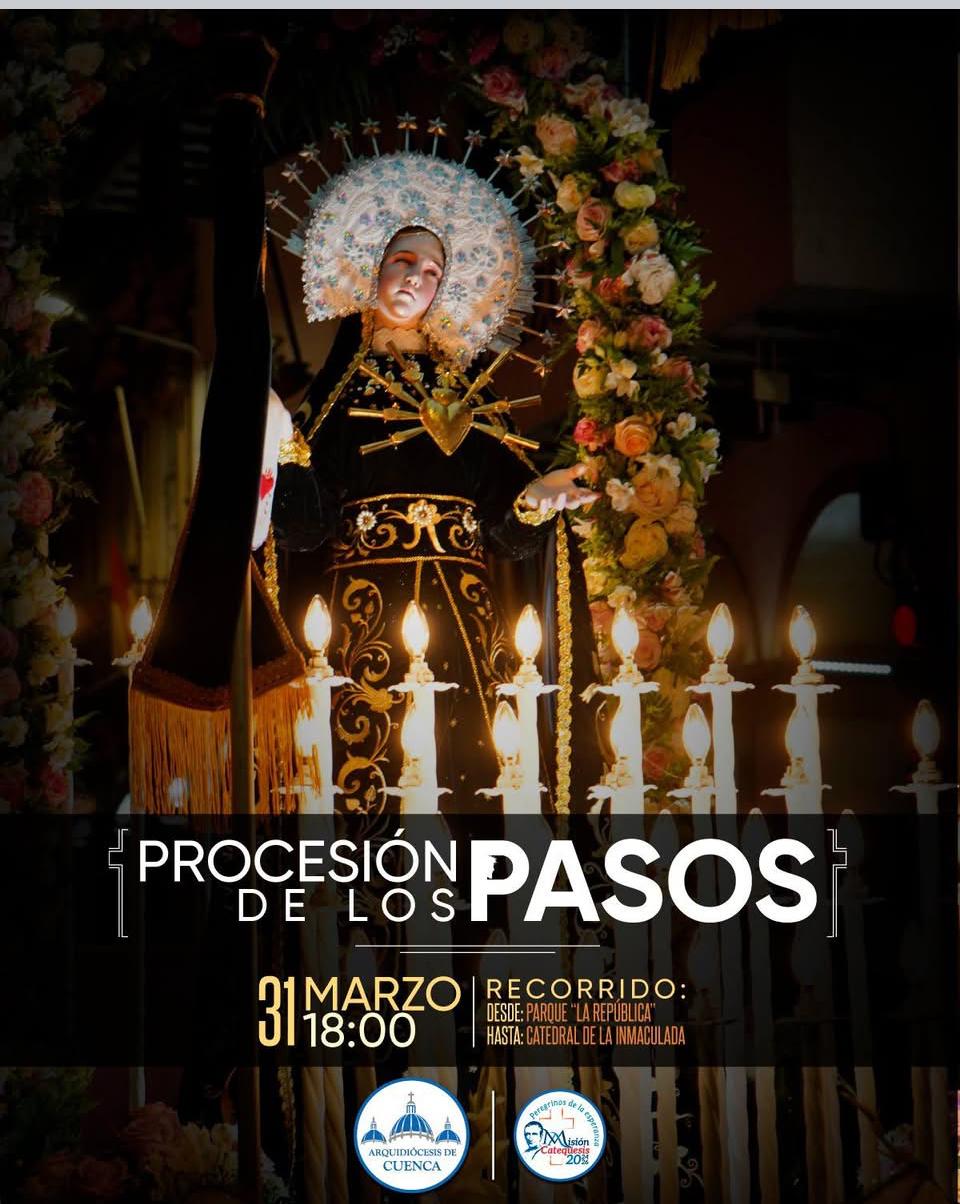 La Arquidiócesis de Cuenca invita a la feligresía a la gran Procesión de Los Pasos, que se llevará a cabo el martes 31 de marzo. En esta ocasión, 17 imágenes del patrimonio religioso de Cuenca saldrán de varias iglesias para permitir que el pueblo exprese su fe de manera multitudinaria.