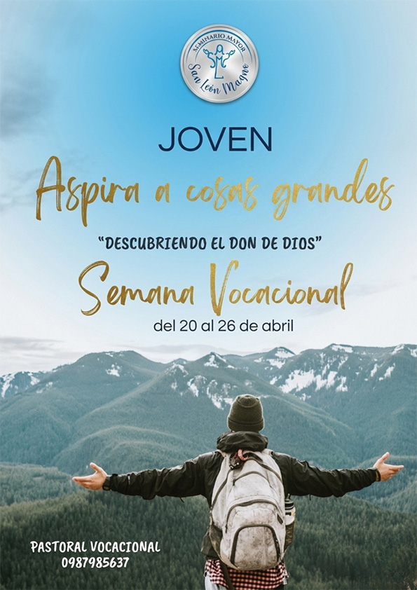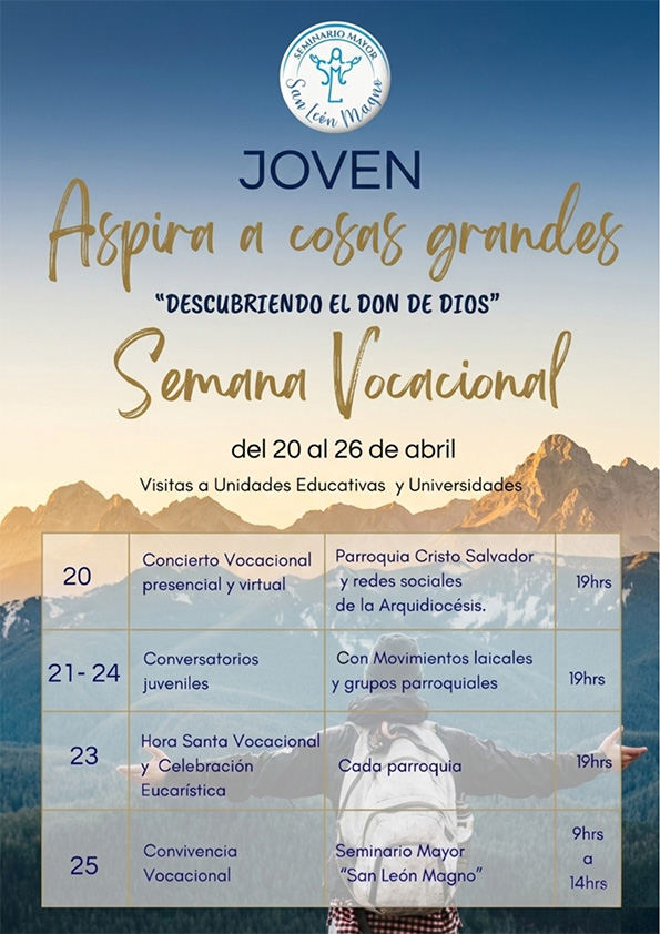 - Este evento se desarrollará durante la cuarta semana del Tiempo Pascual y tendrá como itinerario temático el llamado de Jesús para “Remar mar adentro”. Del 20 al 26 de abril la Arquidiócesis de Cuenca llevará a cabo la Semana Vocacional. La jornad...